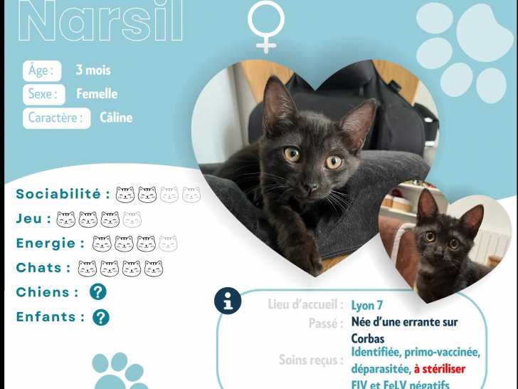 Elle s'appelle Narsil et est âgée de trois mois, cette chatonne de couleur noire que nous vous proposons à l'adoption. Celle-ci s’entend bien avec ses congénères.