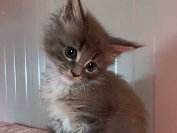 Le Domaine De Clemayje propose, à la réservation, un chaton femelle Maine Coon de couleur bleu tacheté et blanche née le 10 octobre 2021.