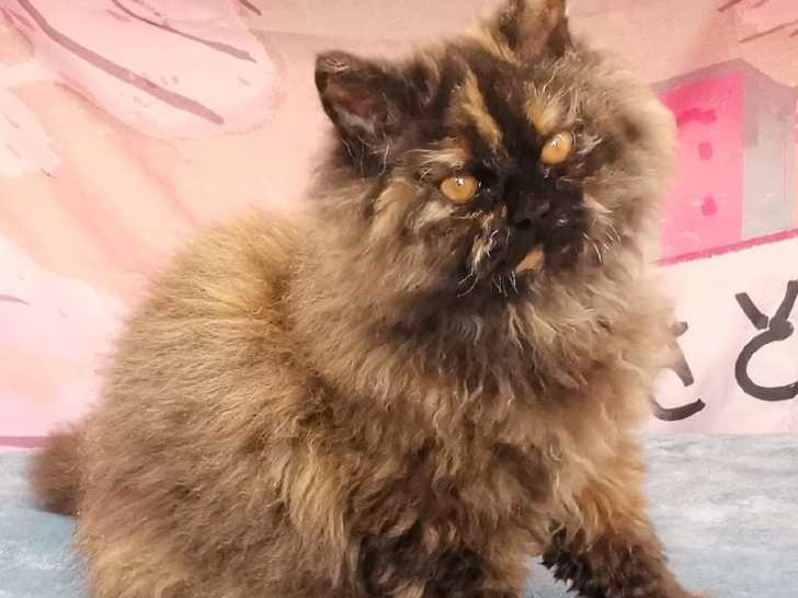 Nous proposons à l’achat une chatonne de race Selkirk Rex à la robe noire fumée et marron née le 28 juin 2021 des parents Radioactive de Mirkwood hétérozygote chocolat tortie golden shaded et Silverdust Francisco homozygote crème fumée.