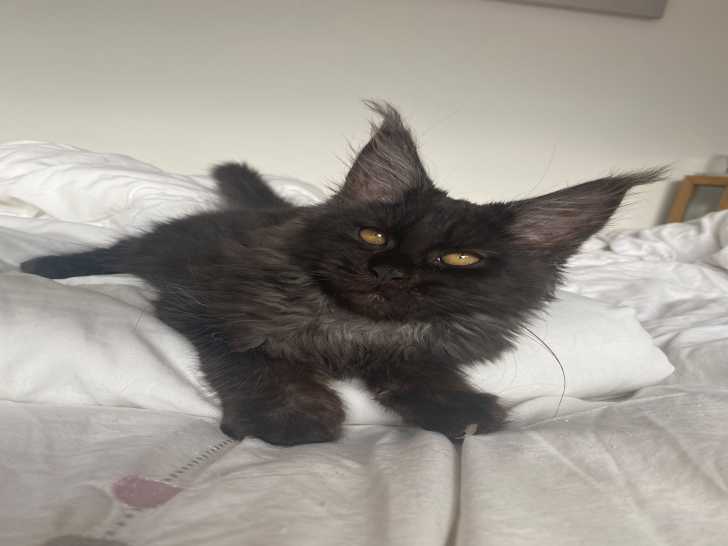 Une adorable chatonne Maine Coon LOOF est à réserver. Elle est née le 9 mars 2024. Elle est de couleur black smoke.
