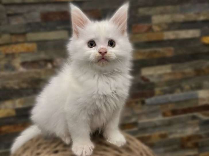 Alaska est un Maine Coon mâle blanc né le 31 octobre 2025. Ce bébé inscrit au Livre Officiel des Origines Félines (LOOF) est proposé à la réservation pour 1300 euros.