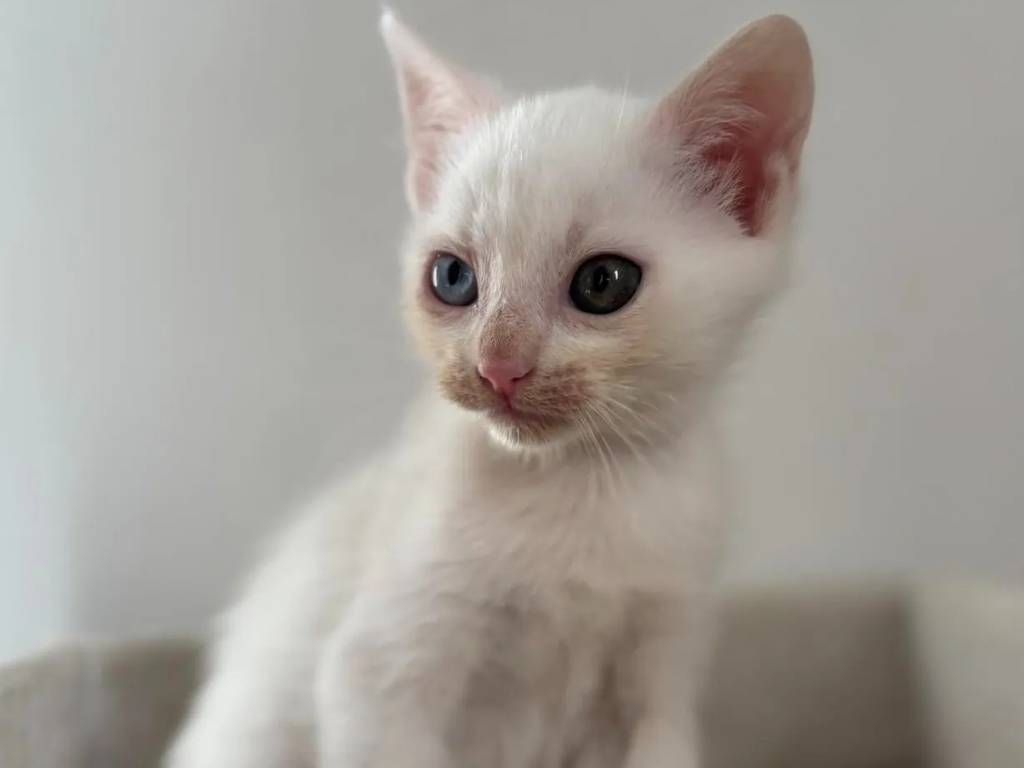 Âgé de deux mois, Saphir est un chaton mâle à la fourrure blanche que nous mettons disponible à l'adoption. Cet animal aspire à trouver une famille qui l'aimera.