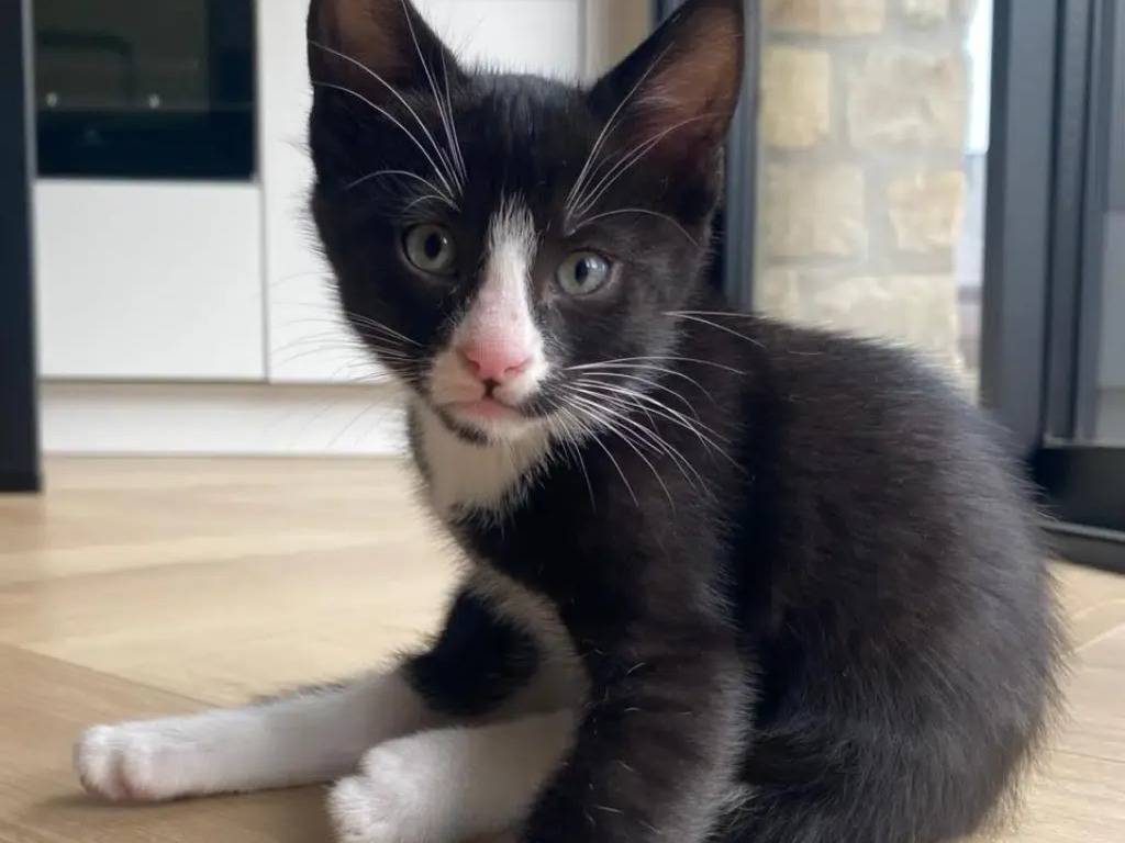 Arboré d'un pelage noir avec marque blanche, Citron est un chaton mâle âgé de cinq mois que nous proposons à l’adoption. Il est sociable aussi bien avec ses congénères qu'avec les chiens.