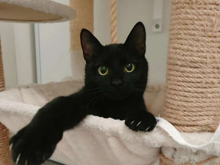 Nous vous proposons à l'adoption ce chaton mâle au pelage noir de sept mois nommé Lumo. Il s’entend bien avec ses congénères, mais pas avec des enfants de bas âge.