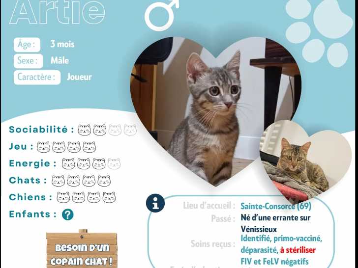 Son nom, c’est Artie, un chaton mâle à la fourrure tigrée de deux mois que nous proposons à l'adoption. Il aura besoin de temps pour s'adapter à son nouvel environnement.