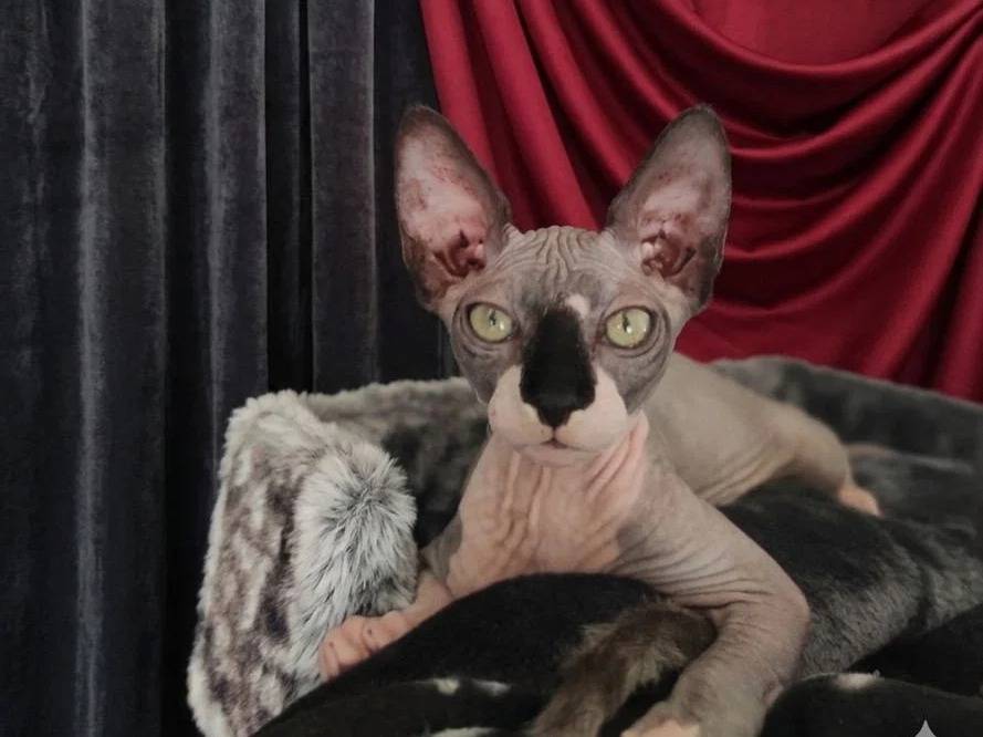 La chatterie Le Règne Des Sphynx vous présente Aïko, un chaton mâle Sphynx bicolore noir et blanc, né le 31 décembre 2025.