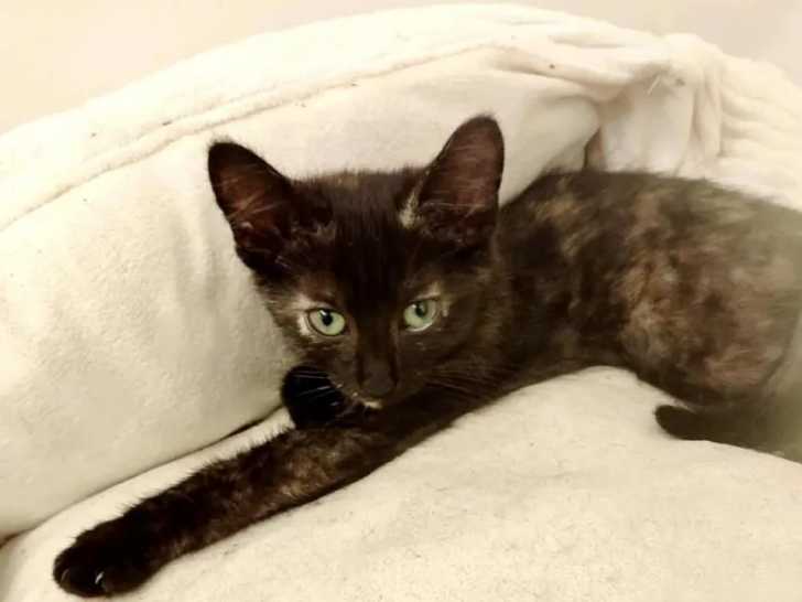 Nous avons le plaisir de vous proposer à l'adoption ce chaton femelle au pelage écaille de tortue nommé Agate. Âgée d’un mois, elle ne peut pas vivre avec des enfants et des chiens.