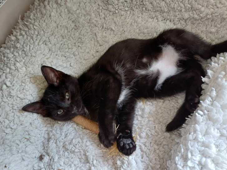 Notre association vous propose à l'adoption cette chatonne noire avec marque blanche de trois mois qui s’appelle Nera. Cette dernière peut vivre avec des enfants.