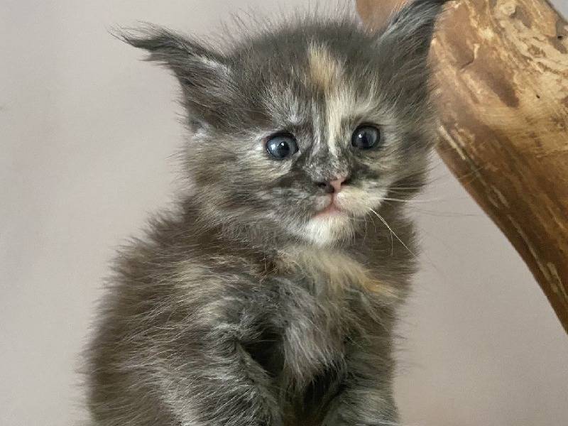 Il y a des chatons qui s’imposent par l’énergie. Betty, elle, choisit la douceur. Cette petite femelle Maine Coon black tortie smoke avance à pas feutrés, observe longuement, puis vient se blottir comme si elle avait toujours fait partie de vous. Son pelage fumé joue avec la lumière et révèle des nuances profondes, presque veloutées, qui accentuent la finesse de ses traits. Elle grandit dans un environnement attentif où nous privilégions le contact humain et la stabilité.
