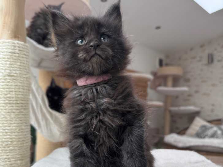 Nous avons le plaisir de vous proposer une splendide chatonne Maine Coon de couleur black smoke, une robe élégante et recherchée, qui reflète toute la noblesse de cette race. Elle est née le 02/10/2024.