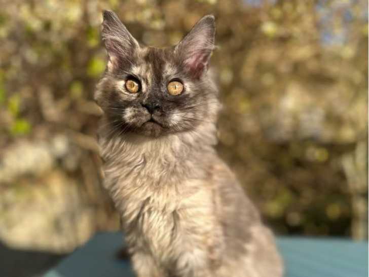 Nous proposons Astéria, une adorable chatonne Maine Coon née le 24 septembre 2025, à la vente pour 1200 euros. Cette femelle black smoke tortie, inscrite au Livre Officiel des Origines Félines (LOOF), est issue de parents testés négatifs pour les maladies génétiques par ADN et échographies sur plusieurs générations.