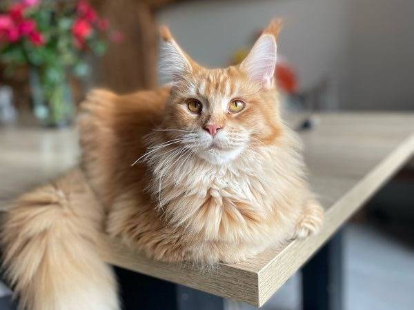 Arlette du Démon d'or, superbe femelle Maine Coon red ticked tabby née le 17 janvier 2025, est disponible à la suite de notre cessation d'activité. Cette belle de lignée Gonsiorline Akkord a effectué un test Genindex.