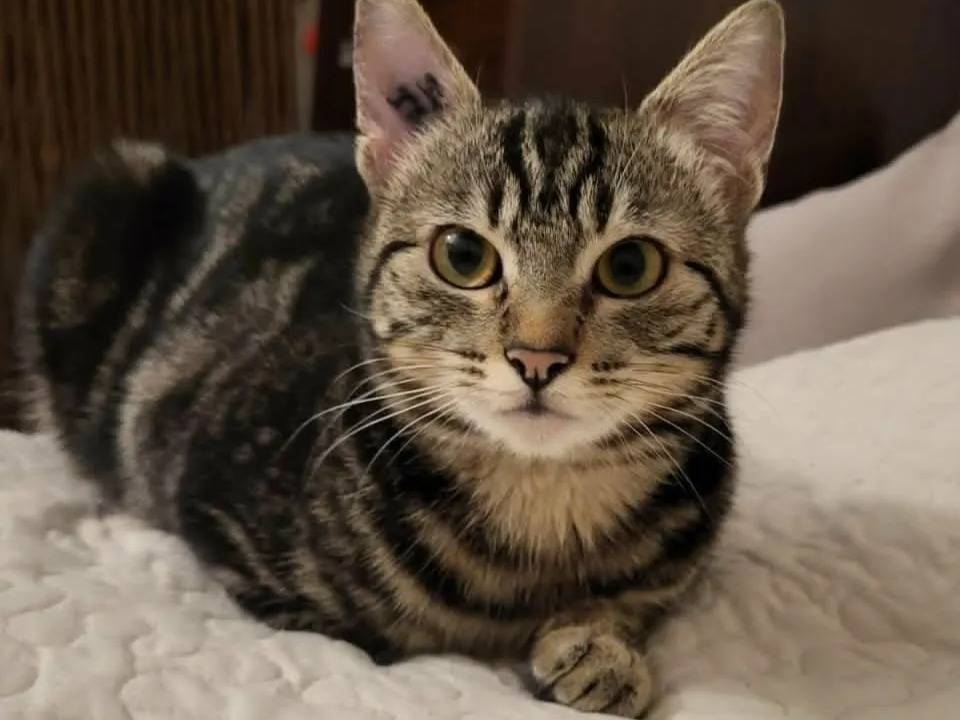 Nous vous offrons l'opportunité d’adopter ce chaton femelle au pelage tigré de six mois appelé Poupette. Une famille aimante qui a déjà un chat lui conviendra parfaitement.