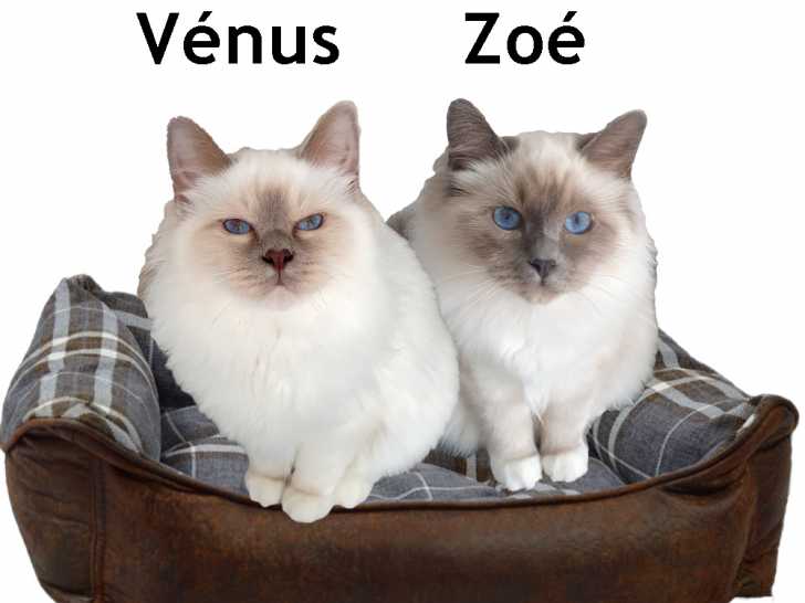 Nous sommes 2 chatonnes Sacré de Birmanie LOOF. Vénus est de couleur lilac point et Zoié est de couleur blue point. Nous vivons avec nos parents (humains et chats) en famille, nous partageons toute la maison avec les 2 enfants au sein de ce petit élevage familial, ce qui permet une parfaite sociabilisation (mais nous n'avons aucun accès à l’extérieur).