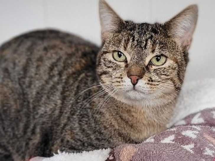 Nous vous offrons l'opportunité d’adopter Flower, une chatte au pelage tigré d’un an aspirant à trouver une famille qui lui donnera de l’attention.