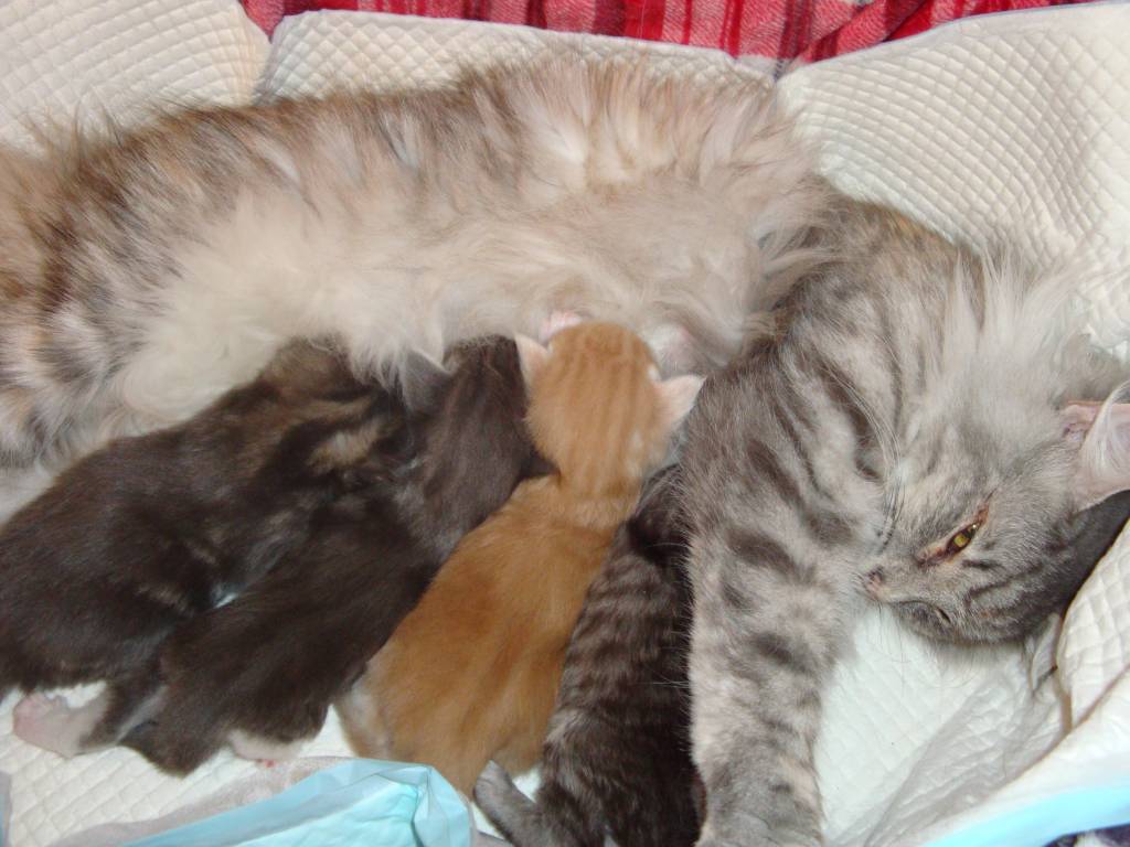 Ulrike de Caminas, femelle black tortie silver blotched tabby, a encore succombé au charme de son R'Mès du Cerisier rose (mâle brown blotched tabby et blanc), et cette union a permis la naissance des 4 p'tits dodus.