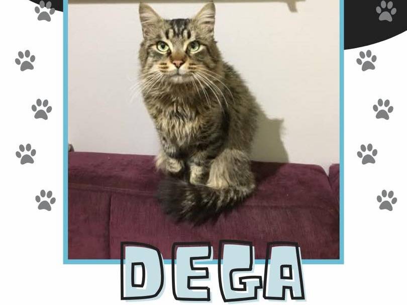 Dega est un chat câlin mais un peu craintif. Il apprécie le contact avec l’humain, mais a besoin de douceur et de patience pour se sentir totalement en confiance.