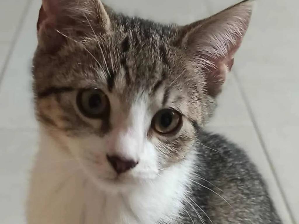 Voici Harry, un adorable chaton femelle de couleur grise et blanche que nous vous proposons à l'adoption. Âgée de trois mois, elle recherche un foyer qui pourra l’adopter en duo avec une de ses sœurs.