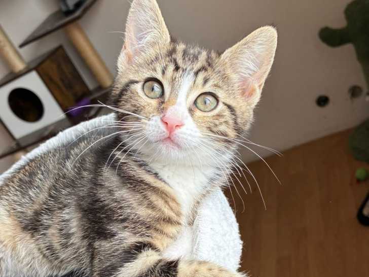 Âgée de deux mois, Cacahuète est une chatonne à la fourrure tigrée blanche que nous mettons disponible à l'adoption. Elle a beaucoup d'amour à donner.