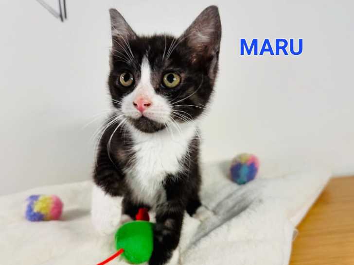 Nous vous proposons à l'adoption ce chaton mâle noir et blanc âgé de trois mois nommé Maru.