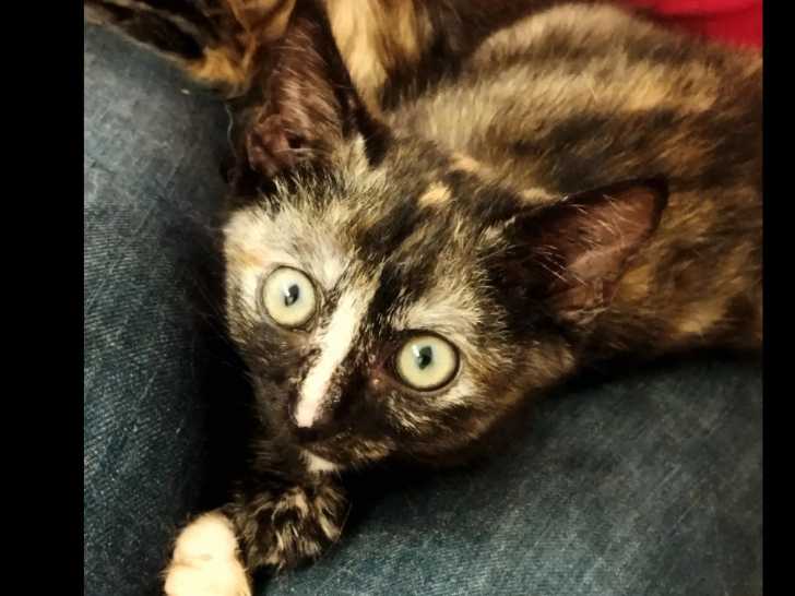 Nous mettons disponible à l'adoption ce chaton femelle au pelage écaille de tortue nommé Ankara. Cet animal est âgé de trois mois et espère trouver une famille douce, vivant en appartement.
