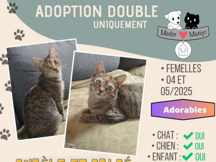 C’est avec plaisir que nous vous proposons à l'adoption ces chatonnes tigrées rousses de sept mois prénommées respectivement Angèle et Aglaé. Sociables avec des enfants, elles recherchent une famille présente qui leur offrira une vie épanouie.