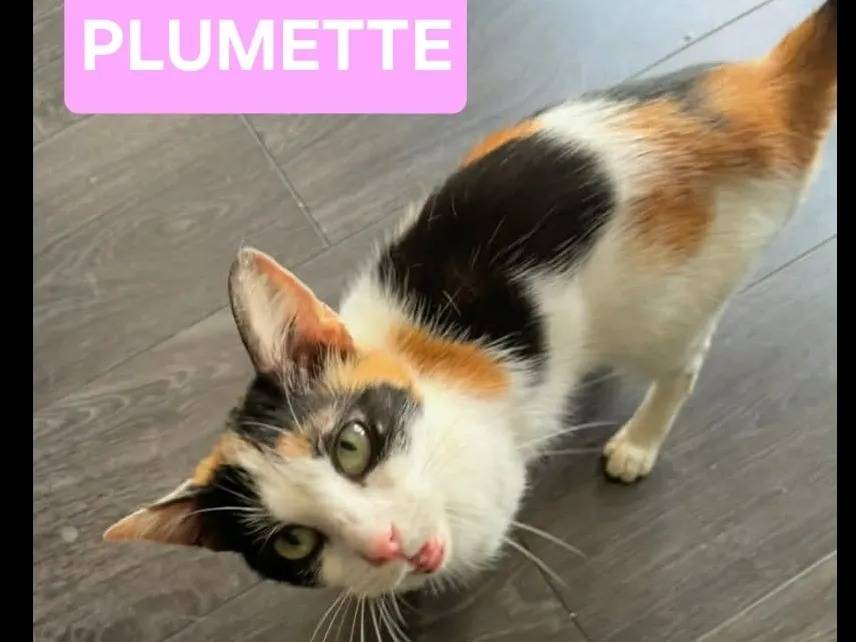 Arborant un pelage tricolore, Plumette est une chatte de deux ans et demi, réservée au premier abord puis très câline, bavarde et curieuse, qui appréciera une famille douce et attentive.