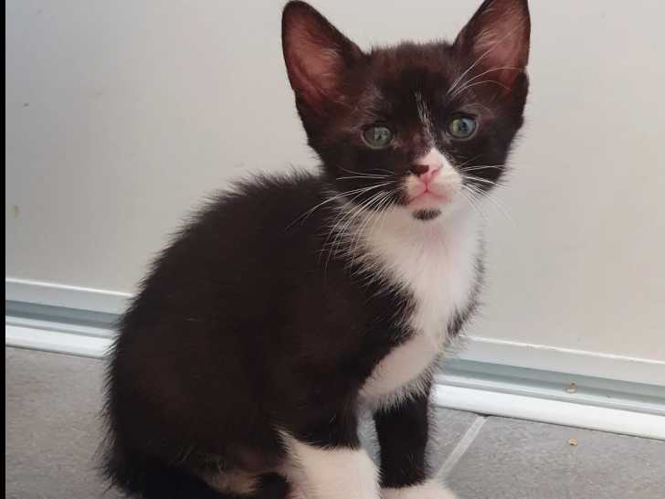 Arborant un pelage noir et blanc, Pastis est un chaton mâle âgé d'un mois que nous proposons à l'adoption. Il sera disponible à partir du 31 juillet 2025.