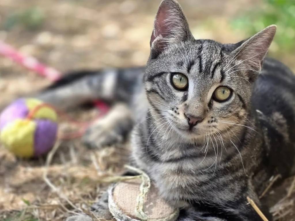Ce jeune chat de couleur tigrée et âgé d’un an nommé Tac est disponible à l'adoption chez nous. Il recherche une famille aimante qui pourra l’accueillir en duo avec son frère Tic.