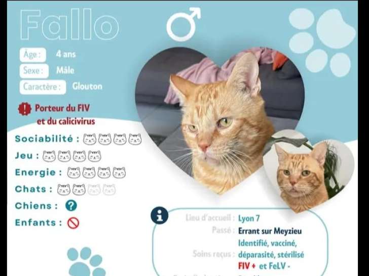 C’est avec plaisir que nous vous proposons Fallo, un chat tigré roux âgé de quatre ans. Affectueux et joueur, il recherche une relation exclusive avec son adoptant et ne s’entend pas avec les enfants ni avec les autres chats. Cet animal est porteur du virus de l’immunodéficience féline.
