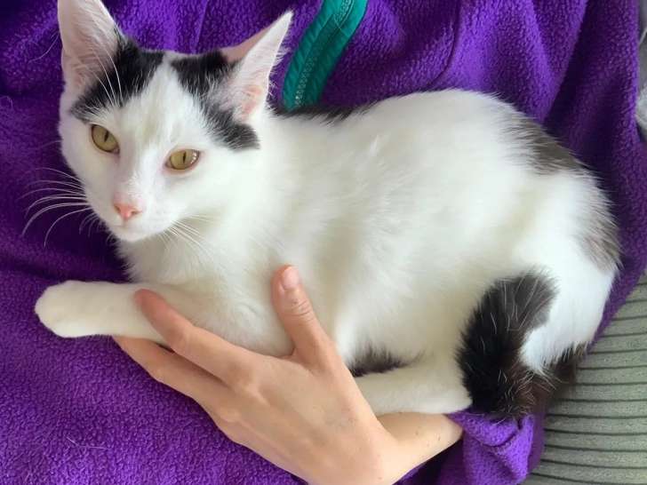 Voici Dino, un chaton mâle au pelage blanc avec des marques noires, âgé de six mois. Né en extérieur et d'abord très timide, il s'est rapidement épanoui en famille d'accueil et réclame aujourd'hui des câlins à tout moment. Il s'entend très bien avec les chiens.