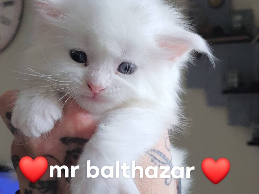 Une petite chatterie familiale propose à la vente 3 magnifiques chatons Maine Coon Ils sont nés le 19/01/2026 et sont à réserver ! Chatonsblancs aux yeux bleus.