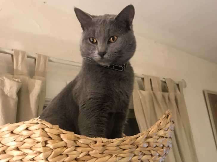 C’est un chat de grand gabarit au pelage bleu et aux yeux couleur ambre. Il est très doux.