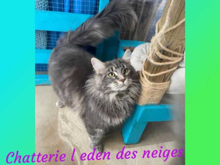 Nous proposons notre mâle reproducteur "Up and Go du Démon d'Or" pour saillie au tarif de 600 euros. Né le 9 juin 2023, ce Maine Coon bleu inscrit au Livre Officiel des Origines Félines (LOOF) possède un gran...