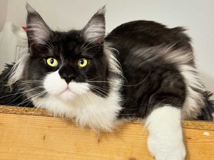 Il a un an et pèse actuellement 8,5 kg. Le Maine Coon grandit jusqu'à 3 ans.