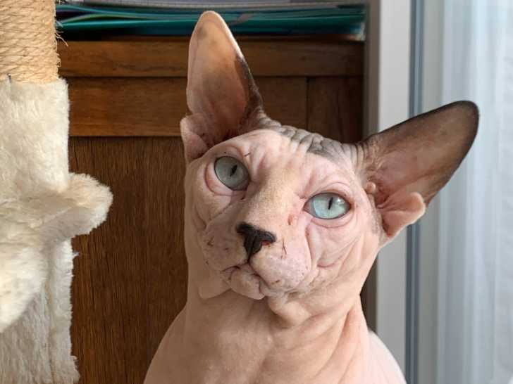 Nous vous proposons Guy, notre Sphynx mâle de 2 ans et demi, pour saillie. Il a les yeux bleus et a le pelage bicolore noir et blanc.