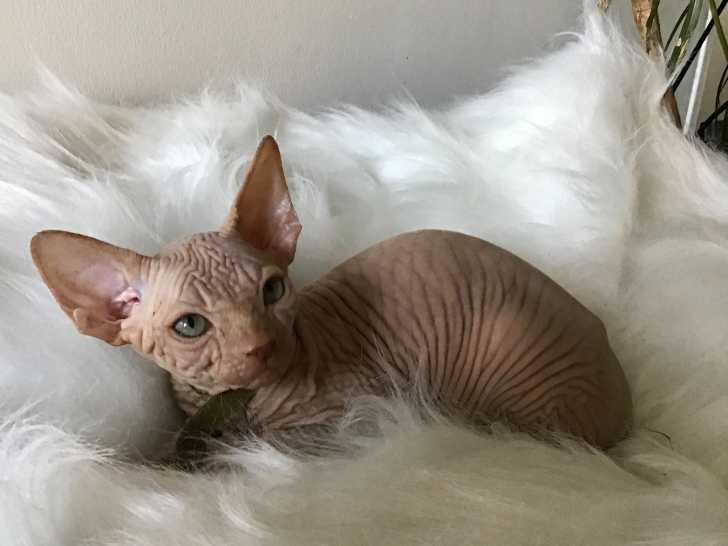Unik de Qaïssa, chaton Sphynx inscrit au LOOF, de couleur rousse et aux magnifiques yeux verts, est à vendre. Il est entièrement vacciné, pucé et stérilisé. Il est disponible immédiatement.