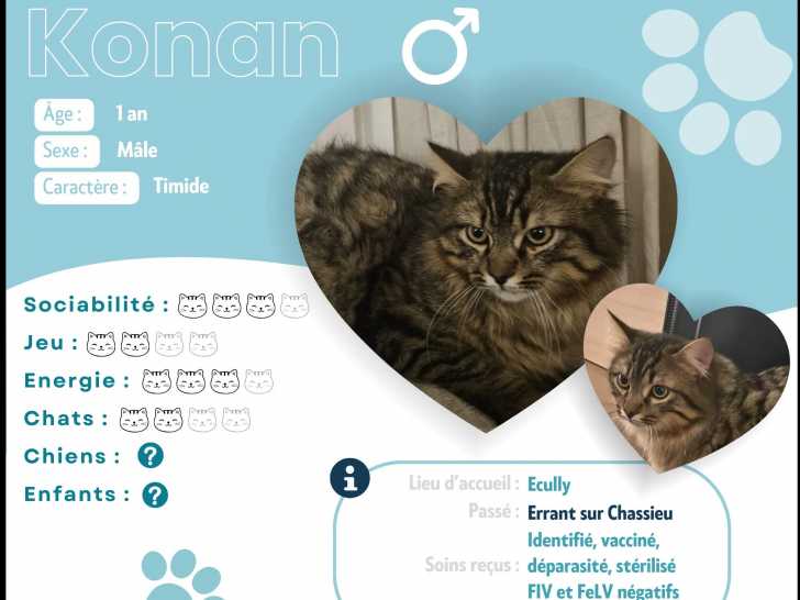 Son nom, c'est Konan, ce chat tigré d’un an que nous avons le plaisir de vous proposer à l'adoption. Il attend une famille calme qui n’a pas d'autres animaux domestiques.
