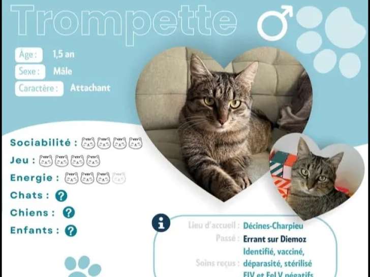 Trompette n’est pas à vendre mais à adopter. Une contribution est demandée afin de prendre en charge son alimentation, ses soins, son hébergement et l’ensemble des frais engagés pour son bien-être.