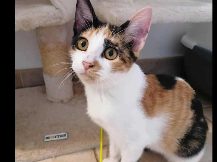 Nous mettons disponible à l'adoption Maya, une chatonne à la fourrure tricolore de quatre mois. Elle est sociable avec les autres animaux de compagnie.