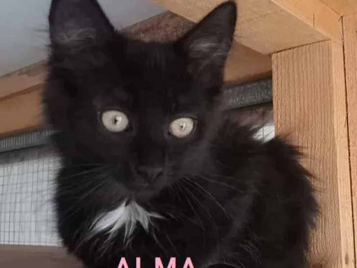 De couleur noire avec marque blanche, Alma est un chaton femelle âgé de deux mois que notre association vous propose à l'adoption. Celle-ci se révèle sociable envers tout le monde.