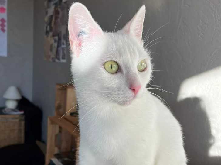 Nous sommes enchantés de vous proposer à l'adoption Vésuvia, une jeune chatte de couleur blanche et âgée de deux ans. Elle espère une famille avec un jardin et sans d'autres animaux domestiques pour une vie heureuse.