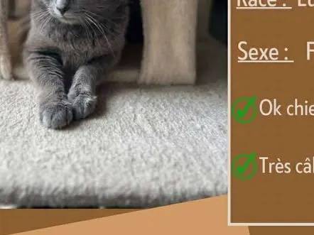 Nous vous proposons à l'adoption cette chatte de couleur grise et âgée de trois ans nommée Awaï. Elle est sociable avec ses congénères ainsi qu'avec les chiens.