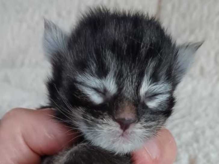 Né le 11 février 2026, ce chaton mâle d’apparence Maine Coon présente une ossature large et une fourrure en devenir aux reflets brown, dense sous la main et prometteuse pour l’âge. Son allure se dessine déjà avec assurance et son regard clair, encore juvénile, s’ancre avec intensité lorsqu’il observe son environnement, traduisant une belle curiosité.