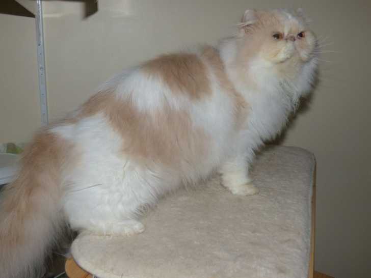 Power du nid de ch'adore, un mâle Persan crème et blanc bicolore âgé de 6 ans et demi, recherche une famille pour sa retraite. Ce chat sociable, habitué aux chiens et aux soins, adore les câlins une fois la confiance établie et est inscrit dans le Livre Officiel des Origines Félines (LOOF).