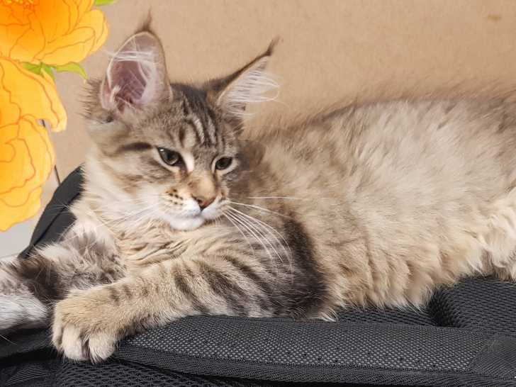 Nous vendons chez Legendia Cats cette chatonne Maine Coon née le 17 mai 2021 au pelage brown mackerel tabby que nous surnommons Sakura. Cette dernière a une identification par puce, et est enregistrée dans le Livre Officiel des Origines Félines (LOOF).