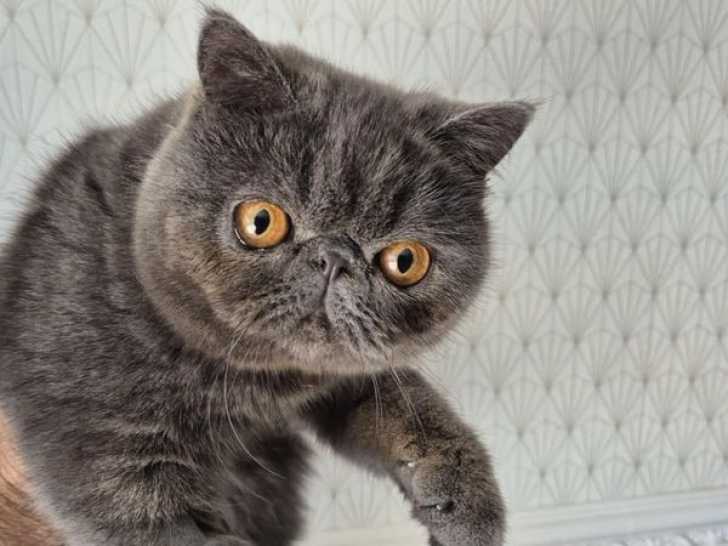 Notre chatterie présente à l'achat Zola, un jeune chat Exotic Shorthair bleu, né le 06 juillet 2024, âgé de 11 mois. Ce chat au caractère doux et joueur est castré, pucé et inscrit au Livre Officiel des Origines Félines (LOOF).