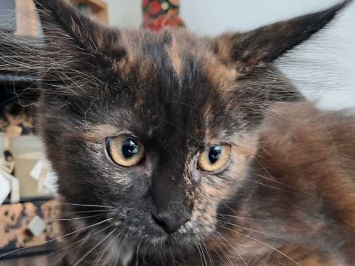Azraelle, femelle Maine Coon née le 13 mai 2025, est disponible à l’adoption. Elle est issue d’une portée de cinq chatons élevés dans notre chatterie familiale Cats of Cthulhu, située près de Caen. Cette chipie au pelage black tortie adore les câlins et les hauteurs.