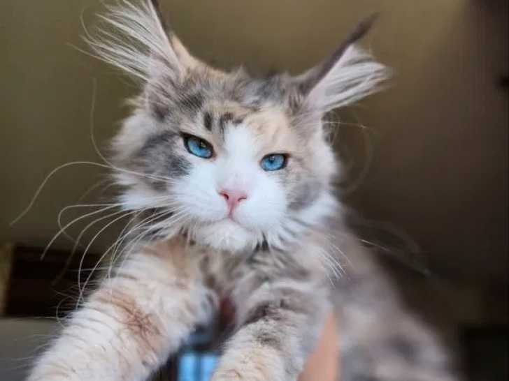 Nous avons une merveilleuse chatonne Maine Coon à l’adoption, Astra, une femelle bleu tortie et blanc aux yeux bleus, âgée de 6 mois et demi.