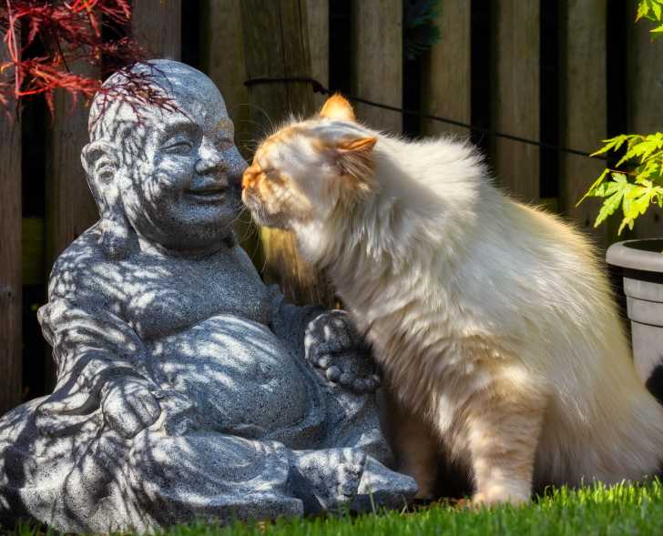 La question est cependant loin de faire consensus – d’où le fait que de nombreux adeptes ne rechignent guère à partager leur quotidien avec un animal. Certains vont même jusqu’à affirmer que le comportement des chats peut être considéré comme une véritable source d’inspiration. C’est le cas notamment de l’Américain Alan Peto, pratiquant et spécialiste du bouddhisme, auteur en 2020 du livre The Buddhism Secrets of Cats: Discovering the Hidden Lives and Teachings of Buddhist Cats. Il y explique comment ces animaux l’inspirent dans sa pratique spirituelle. Leur détachement, leur pleine conscience de leur environnement et leur caractère indépendant sont ainsi autant de qualités que certains adeptes cherchent eux-mêmes à acquérir dans leur vie spirituelle.